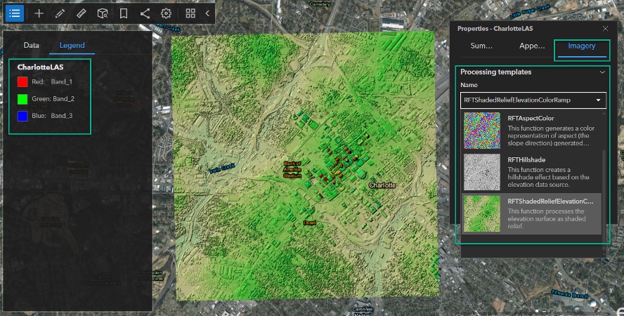 - Image rendering capabilities have greatly improved by providing server-side processing templates associated with image services for on-the-fly rendering and powerful visual analysis. If processing templates have been added to rasters, a preview thumbnail and information about the name, description, and help will be displayed for each processing template. Available processing templates and options can be accessed through the image properties menu. Vegetation indices, elevation products (such as slope, aspect, and hillshade), and image classification results are just a few of the kinds of information layers that can be derived using raster functions.