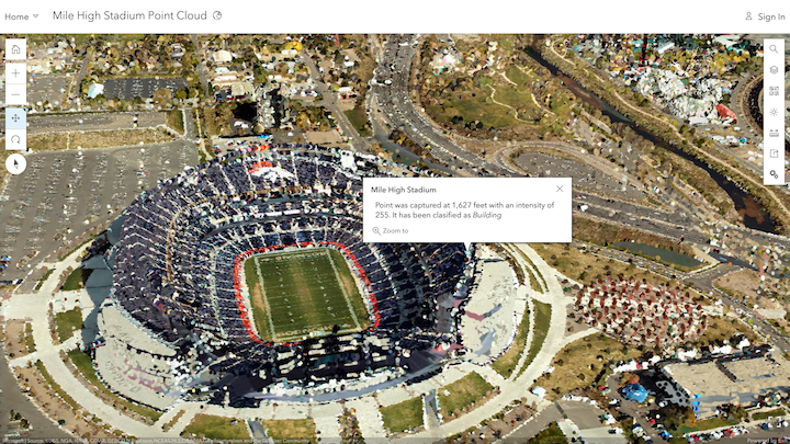 Utilize the vast amount of information in LiDAR and photography-based point clouds to see details about each point in the point cloud scene layer. This helps you better understand information about color, classification code, elevation, intensity and other variables. With pop-ups enabled in Layer Properties, click a point in the point cloud and immediately see detailed attribute information.
