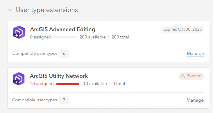 Once the ArcGIS Utility Network user type extension licenses have been unassigned from members, it will be removed from the licensing page. Administrators can then assign members the ArcGIS Advanced Editing user type extension license to members through this same experience.
