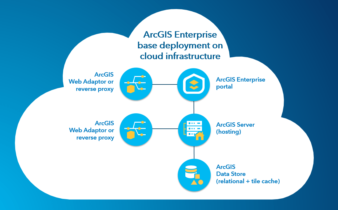 ArcGIS Enterprise runs and is supported on any cloud platform that meets the basic system requirements. In practice, that means essentially all cloud platforms! Esri has customers running ArcGIS Enterprise on all major cloud providers, including Amazon Web Services (AWS), Microsoft Azure, Google Cloud Platform, Alibaba Cloud, and Huawei Cloud.