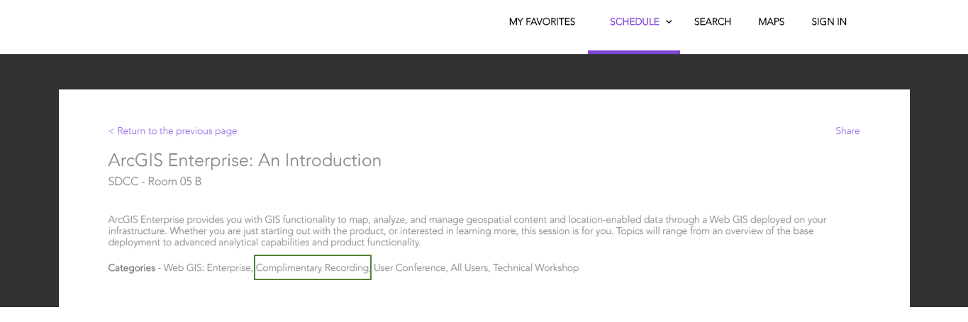 We hope you had a great time at the User Conference and were able to attend ArcGIS Enterprise sessions and visit the showcase. In the coming weeks, certain sessions with the tag “complimentary recording” will be posted online, as you see below. Slides from the sessions will also be included on the events proceedings page.