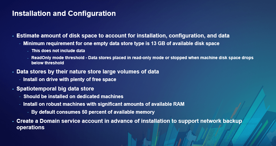 In this session, Bill Major and Laurence Clinton covered best practices for installing, backing up, migrating, and upgrading your ArcGIS Data Store(s). The ArcGIS Data Store component can be configured as three different types: relational, tile cache, or spatiotemporal big data store (remember it’s the “3” in the “5-4-3-2-1” description of ArcGIS Enterprise). Laurence and Bill provided several takeaway tips on installation and configuration – from the minimum amount of disk space required to guidelines on planning where to locate your spatiotemporal big data store.