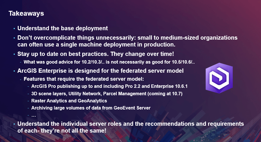 At the ever-popular architecting session, Philip Heede presented strategies for designing and deploying ArcGIS Enterprise, primarily for system architects and IT administrators. Philip’s big reminder: “Don’t panic!”