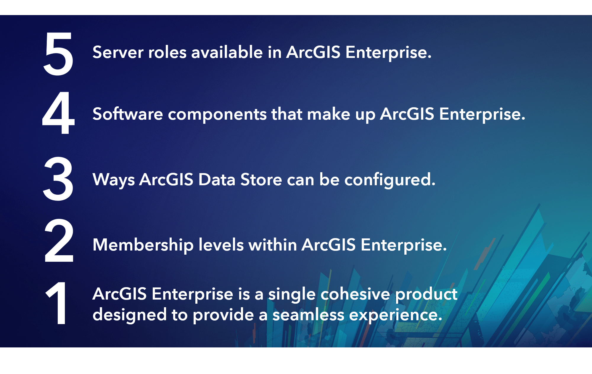 5-4-3-2-1. That’s how Shannon Kalisky, one of the Product Managers for ArcGIS Enterprise, introduced and explained the product. In addition to being catchy, it’s a memorable way to both think and talk about ArcGIS Enterprise as a complete GIS. 5 server roles, 4 software components, 3 ArcGIS Data Store types, 2 named user licenses, 1 product: ArcGIS Enterprise. This session provided an excellent overview of the product and its capabilities. Keep a look out for the complimentary recordings of UC sessions, as this one you don’t want to miss!