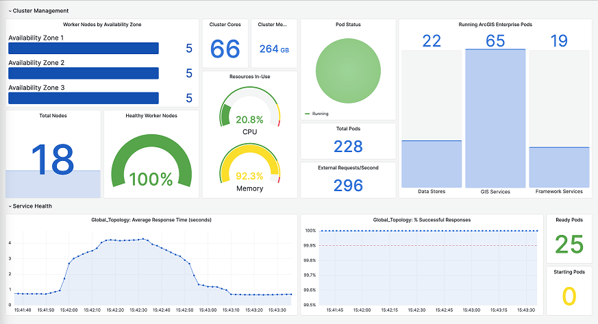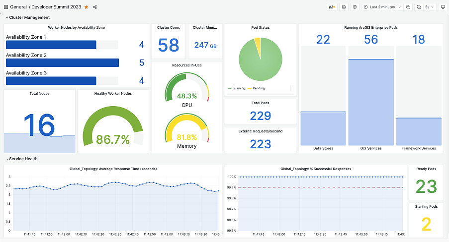 For his demonstration, Chris has set up an ArcGIS Enterprise on Kubernetes deployment. Chris shows us his Grafana dashboard to highlight the current properties of the cluster: