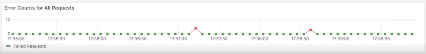 The second chart shows request failures. While some errors have occurred, this chart also shows that critical services remain operational even while Kubernetes is working to rebalance after the outage.