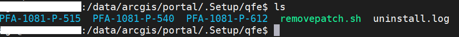 Let’s assume that I want to remove all three of my Portal for ArcGIS patches listed above. To do that, I need to navigate to <Portal install directory>/arcgis/portal/.Setup/qfe. Once there, I see the following: