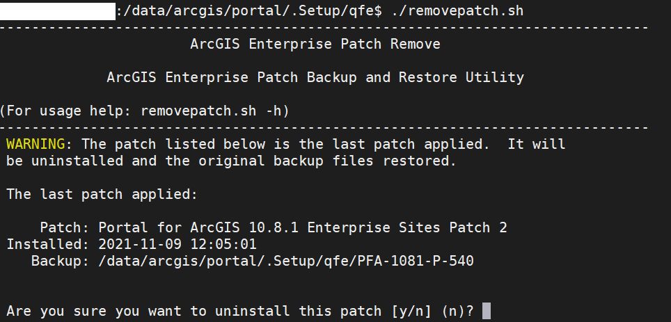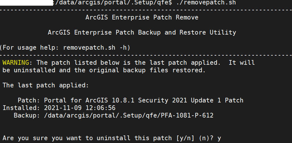 By selecting ‘y’ for yes, my ArcGIS Enterprise will uninstall this patch. However, as previously mentioned, this method only will uninstall one patch at a time. Running removepatch.sh again, we see the next patch ready to be uninstalled: