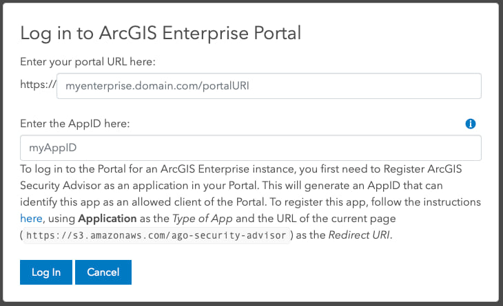 Before a connection is allowed, the ArcGIS Enterprise Admin will need to register the Advisor to create an App ID.