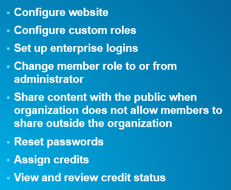 There are two types of privileges available when configuring custom roles—general privileges and administrative privileges. General privileges allow members to perform user-based tasks like content creation, sharing and editing that are required for members to complete their work. Administrative privileges include additional capabilities to manage members, groups and content within the organization. It is important to understand what type of work each member needs to complete and assign only the appropriate privileges to enable your members to be successful. The roles below describe two common user roles for content creators with different sharing needs and two common administrative roles that enable content and member management.