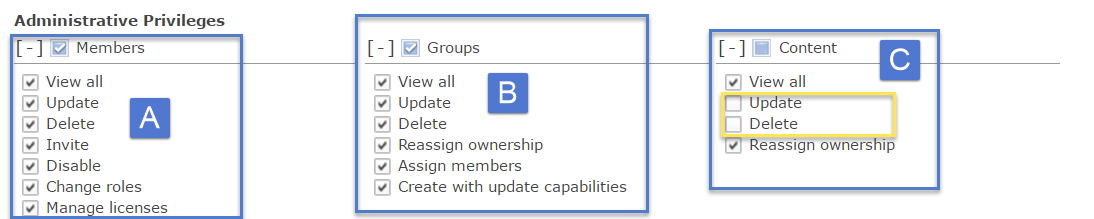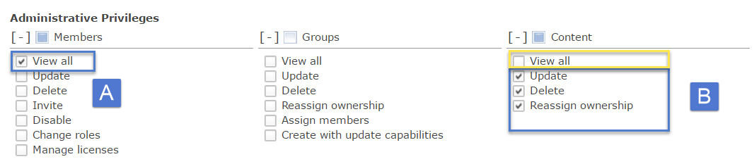 For the Content Manager, start with the Publisher Template which enables most general privileges. This user will need to be able to reassign content to other members in the organization. For this reason, they need the privilege to view all members (A). This user will be able to create groups using the general privileges granted through the Publisher Template. For this example role, the content manager is only responsible for reviewing the content for their department which has specifically been shared with them. For this reason, check on all of the administrative content privileges and un-check View all privilege (yellow)(C). View all content is an inherited permission and must be specifically disabled to limit the visibility of all content for this user.