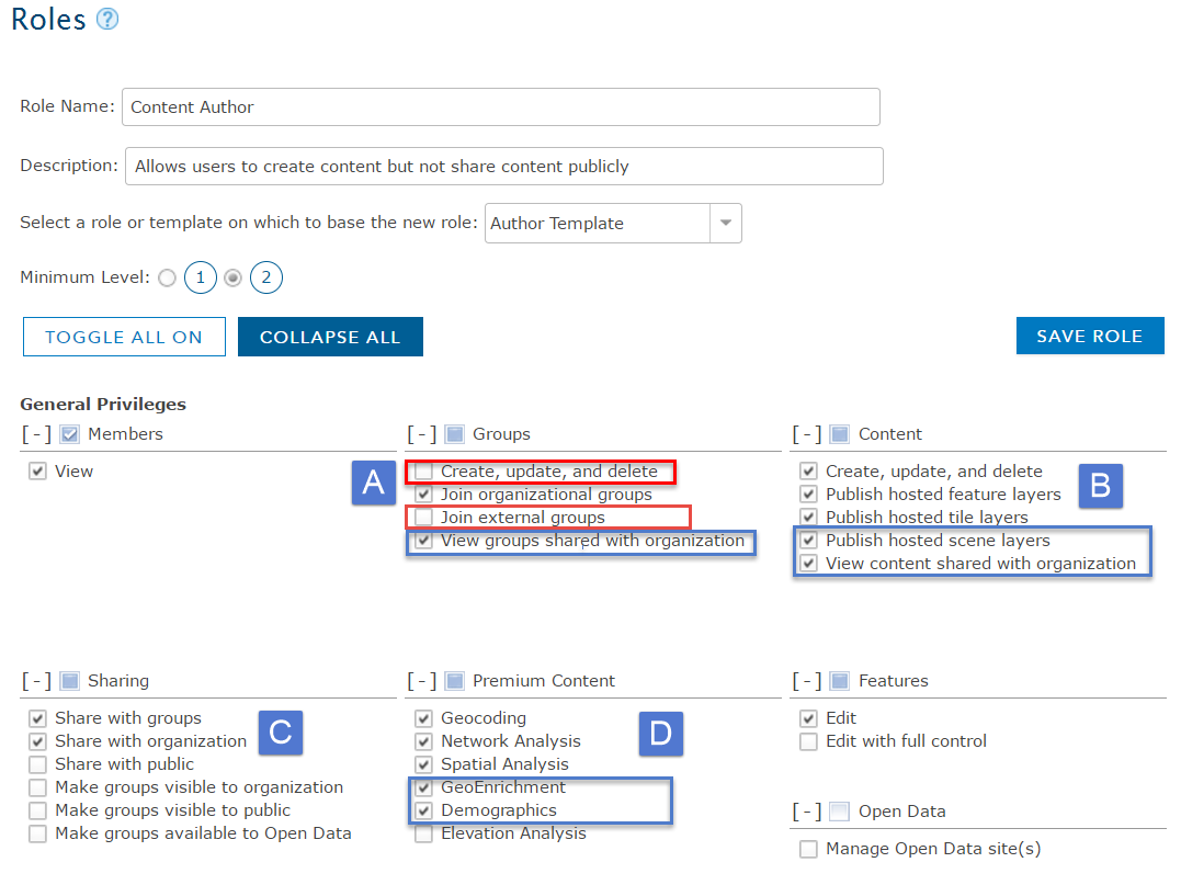 To set up a custom role for a Content Author, use the Author template as a starting point. As this user is responsible for content creation within the organization, they will not have the privilege to create groups nor join groups from other organizations but can view groups shared with the organization (A). The Content Author will be able to create all types of content (B). Under the sharing privileges this user can share with the organization and groups but will not have the capability to share content publicly (C). The Content Author will also need access to GeoEnrichment, and Demographic Services in order to create content using Esri data and include demographic map services in their maps. These privileges are enabled in addition to the default premium content for the author template (D).