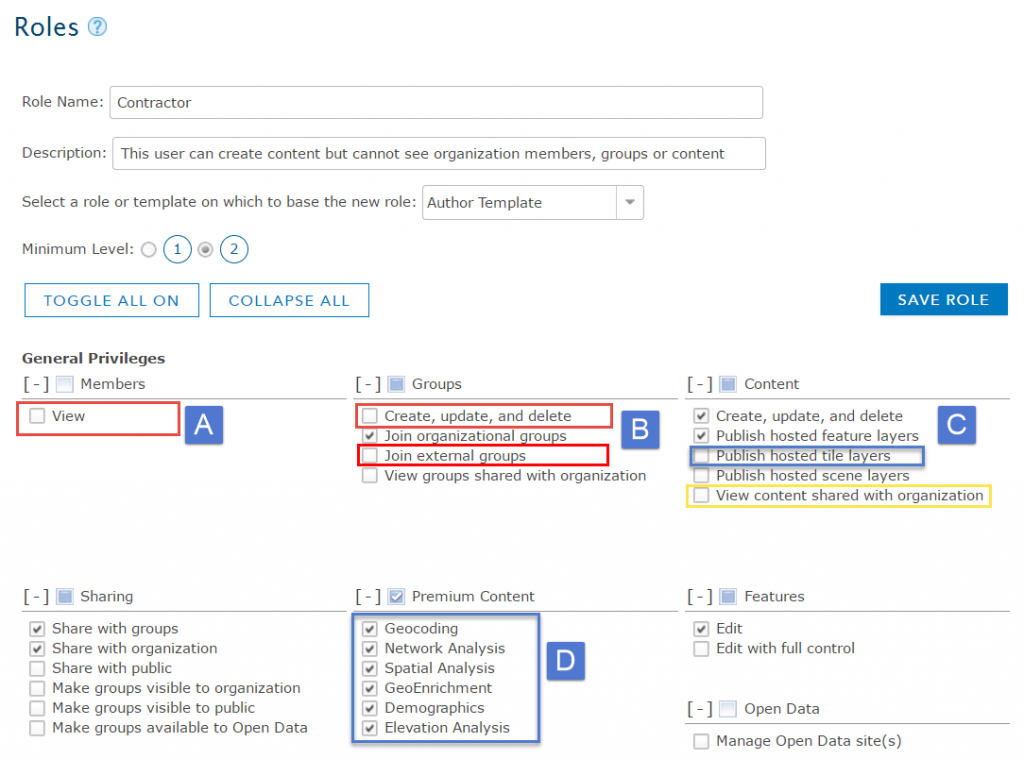 The Author template will also be used as a starting point for the Contractor Role. The sharing, and edit privileges will remain the same as the Author Template role. The view privilege under the members tab is disabled and prevents the user from viewing the My Organization page. The contractor won’t be able to see the other members in the organization (A). They will have the ability to join groups they are invited to, but can’t create or view groups shared with the organization (B). This contractor is responsible for creating feature layers and apps, so they do not have privileges to publish hosted tile or scene layers. They are prevented from viewing content that is shared with the organization (yellow) (C). This contractor will be using the create Viewshed tool, so will need to have access to the elevation analysis service (D). This will allow the user to create content for the organization without viewing any private information.