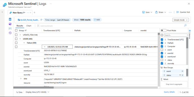 For this portion of the demonstration, Bill shows an ArcGIS Enterprise organization that uses an agent that ingests these audit logs into an SIEM. Using the SIEM, Bill can query for specific patterns, such as excessive failed login attempts. He can also set up alerts for specific patterns so that he receives near real-time when events occur.