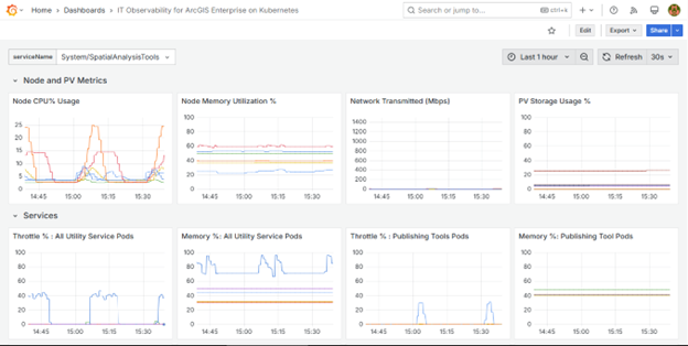 Next, Bill showcases how ArcGIS aids with administrative observability. To demonstrate, Bill switches to the Grafana dashboard of an ArcGIS Enterprise on Kubernetes deployment. The Grafana dashboard shows a wide range of Prometheus metrics, such as CPU usage and throttling and service-level metrics.