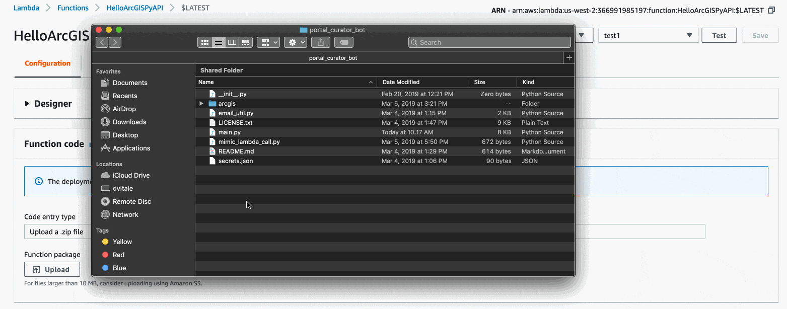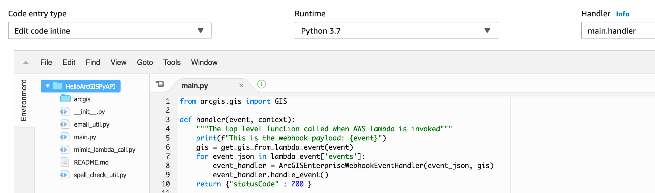 We are almost ready to deploy the Lambda Function, but we have one more thing to take care of. This code uses the ArcGIS API for Python, which is an external Python library that the default AWS Lambda runtime does not include. We will have to follow these instructions to include the arcgis package directory in the root of our archive alongside main.py. The ArcGIS API for Python is released publicly on conda and pypi.