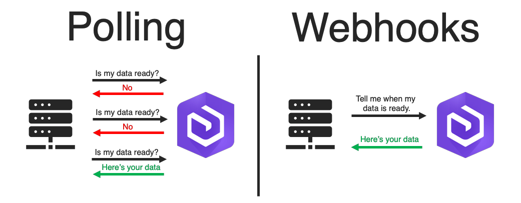 A webhook is an event-driven system that calls the client when an event occurs that the client is interested in. This is contrasted with polling, which is when the client must continuously and inefficiently check if a certain event has occurred. An appropriate analogy is if you are hosting a party and are waiting for a pizza to arrive. A “Polling” solution would be to leave the party and open the front door every 5 minutes to see if your pizza has arrived. A “Webhook” solution would be to stay at the party, and tell the delivery person to ring the doorbell when they arrive.