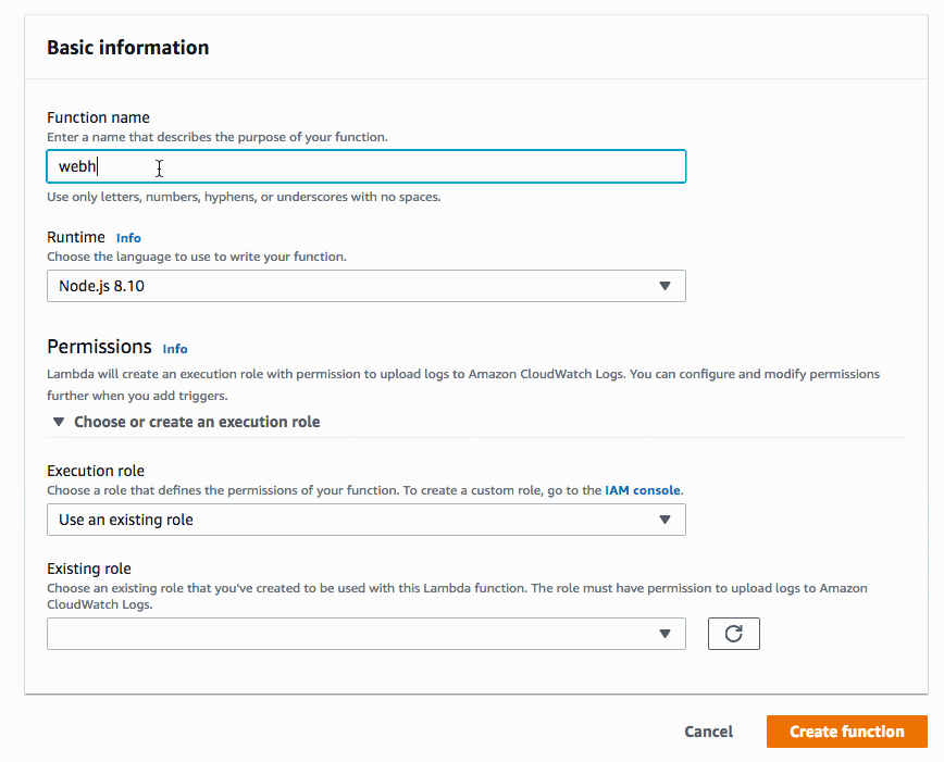 Open the AWS Management Console, press Lambda, then Create Function. Select the most recent Python version and existing role. The role with which we create the Lambda function must have permission to upload logs to Amazon CloudWatch (this is useful for debugging, since all Python print()statements are written to CloudWatch). Once we fill out the form, we will be brought to a page where we will specify our Python code to run.
