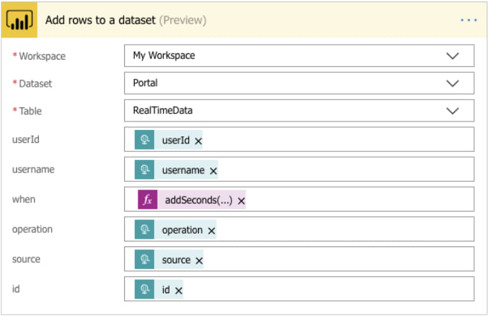 When our flow is created, click the Power BI connector and configure Workspace/Dataset/Table to point it to your Power BI. Configure the webhook payloads fields to the desired data to track.