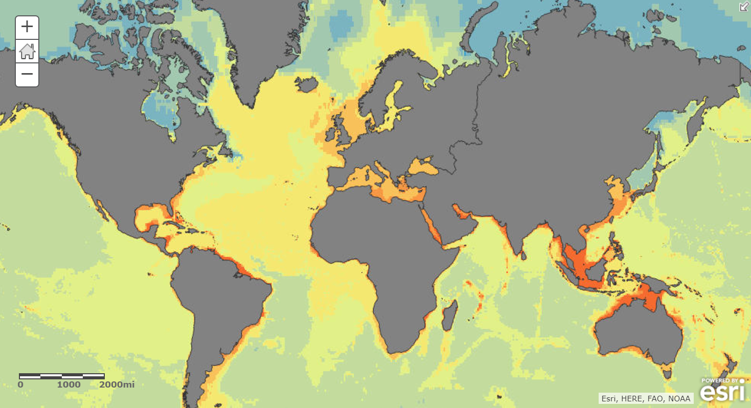 Note: Even with an accuracy of 97.8%, we need to think about the applicability of the model we built to the entire dataset. Just like any other statistical model, Random Forests have their limitations. Although they are powerful interpolators, they are poor extrapolators. Thus, we cannot accurately predict areas where oceanic conditions fall outside the bounds of U.S. coastal conditions. To deal with this limitation, we eliminated areas close to the Poles that fell outside of the bounds of the training data.