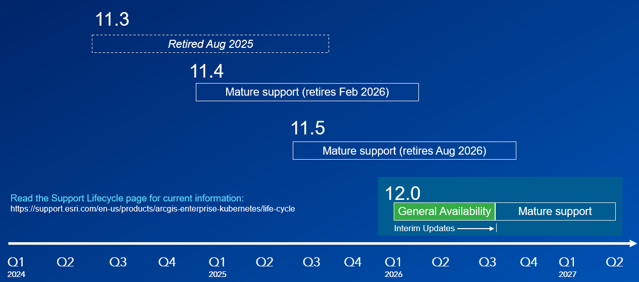 The product lifecycle for Kubernetes is different from ArcGIS Enterprise on Windows or Linux. On Kubernetes, there is no short- and long-term release. The product lifecycles for ArcGIS Enterprise on Windows or Linux remain the same with short- and long-term releases.