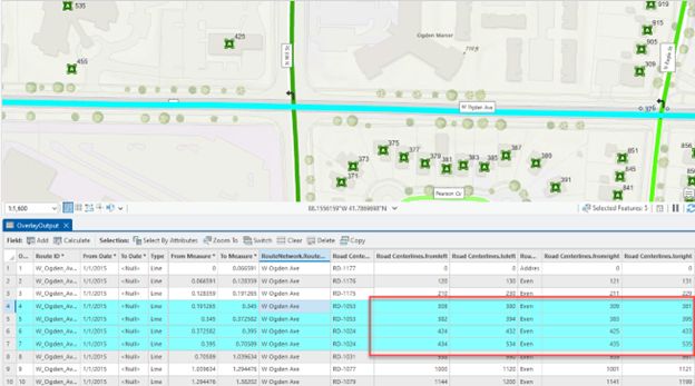 Both the Overlay Events geoprocessing tool and Query Attribute Set REST operation supports including the centerline or event layers that contain address range information in dynamic segmentation operations. At this release, when records from those layers are split during dynamic segmentation, the address information is updated based on the proportion of the split along the centerline/event. The example below illustrates this new capability. The two centerlines representing W Ogden Ave as it approaches N Mill St have the number of lanes change from 4 to 5 lanes. The address block range information on the two centerlines are 308 to 395 and 424 to 535.
