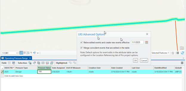Attribute edits on existing events is commonly completed using the attribute table within ArcGIS Pro. To streamline editing workflows data editors now have the option to configure whether an event will retire, and a new event is created when editing business attributes on LRS event data as well as if that event should merge with any adjacent events that share the same attributes. Using an ArcGIS Pro application setting, editors can configure the default behavior for this capability including whether it’s enabled/disabled, what date should be used for retirement, whether coincident events should merge when possible, and whether the dialog with these options appears after an edit.