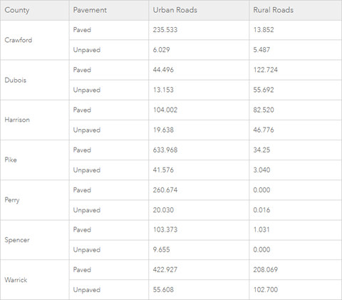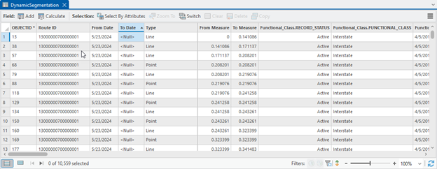 The table view allows users to view the dynamically segmented data as a table and to make updates to an event’s characteristic that might be driven by other related characteristics (such as functional classification and speed limit or pipe diameter and operating pressure).