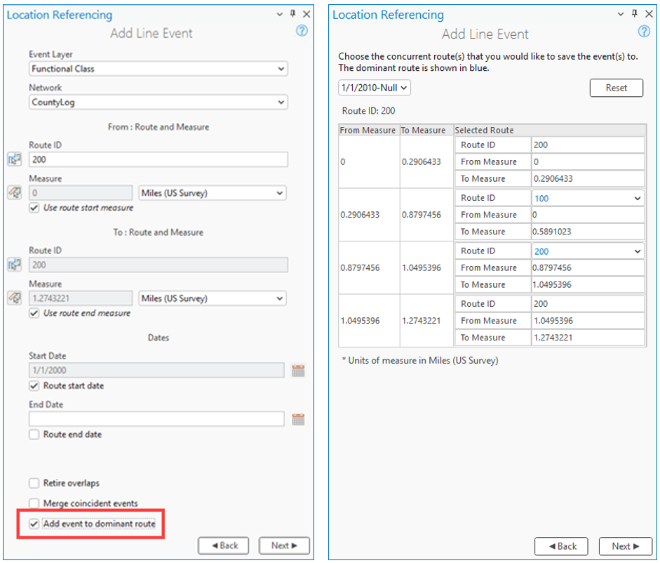 For users with concurrent (overlapping) routes, placement of events onto the primary (dominant) route is important for reporting, calculating certified mileage, HPMS submission, and other operations on LRS data. To ensure events added using ArcGIS Pro are always placed onto the primary route, a new option has been added to the Add Point Event and Add Line Event tools. When enabled, events being added will always be placed onto the primary route if there are concurrencies. This allows users to add events via the way they were collected, but ensure they are placed onto the primary route as they’re added to Roads and Highways/Pipeline Referencing. This option can be enabled/disabled on an edit-by-edit basis or configured as an ArcGIS Pro application setting if business rules are consistent for data editors within the organization.