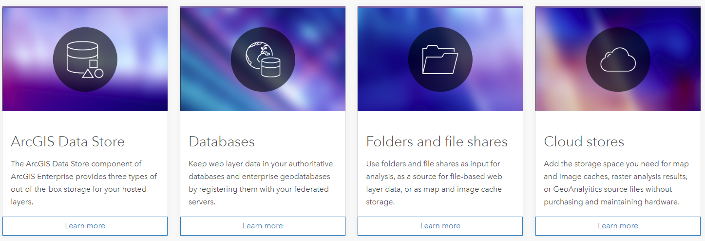 As a second resource, the Data Stores tab of the Enterprise technical documentation has undergone a revamp! Formerly, this page addressed the three types of ArcGIS Data Stores: relational, tile cache, and spatiotemporal. With this new update, we have brought in ‘user-managed’ data sources into the story, to give a holistic perspective of all types of data you can register with Enterprise. To visit the new, updated page, simply click here or head to enterprise.arcgis.com and select the ‘Data Stores’ tab. You can also access the whitepaper via this page in the ‘Read more about data storage options’ row.