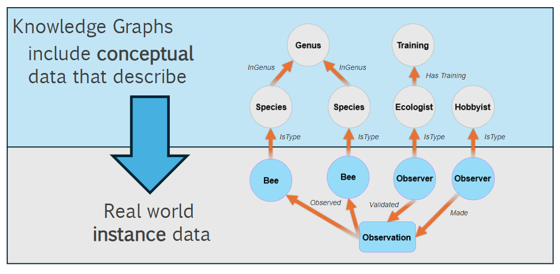 - Conceptual data: This adds another layer, explaining the meaning or semantics behind the instance data. It acts like the official vocabulary or rules that explain how everything in the system is connected and why it’s important for the business or organization. Some organizations and industries may formalize this part as a managed ontology for their organization and data. Historically, this type of modeling has used the OWL language standard whose outputs are RDF files.