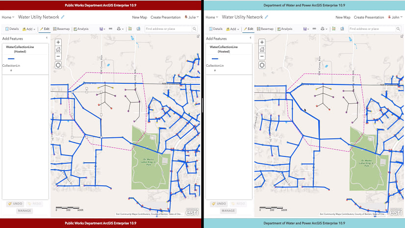 In a second scenario, Indhu shows that a public works field engineer has added a new water collection line feature to the shared data. Once the next hourly sync occurs, the department of water and power sees the newly added feature and its attributes in their organization’s web app.