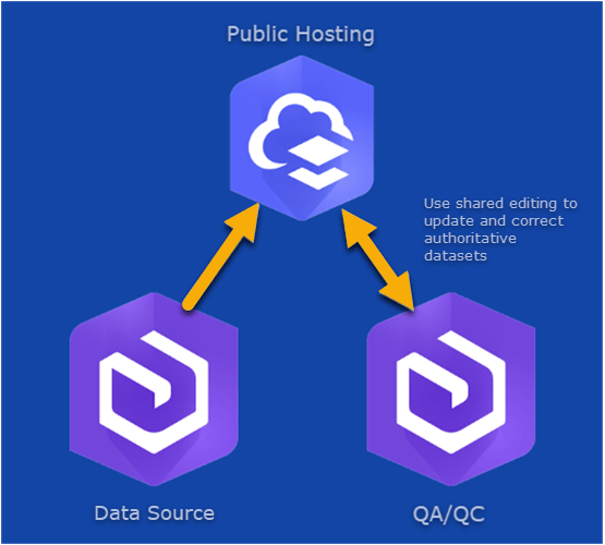 In this scenario shown in the image above, a public facing authority is using ArcGIS Online to host the authoritative dataset. Two contractors are working to furnish the public authority. The Data Source ArcGIS Enterprise organization has a one way collaboration set up to provide the publicly facing ArcGIS Online organization with the base data. The QA/QC contractor conducts data updates to the same dataset, ensuring that the latest data is being updated and validated as time goes on.