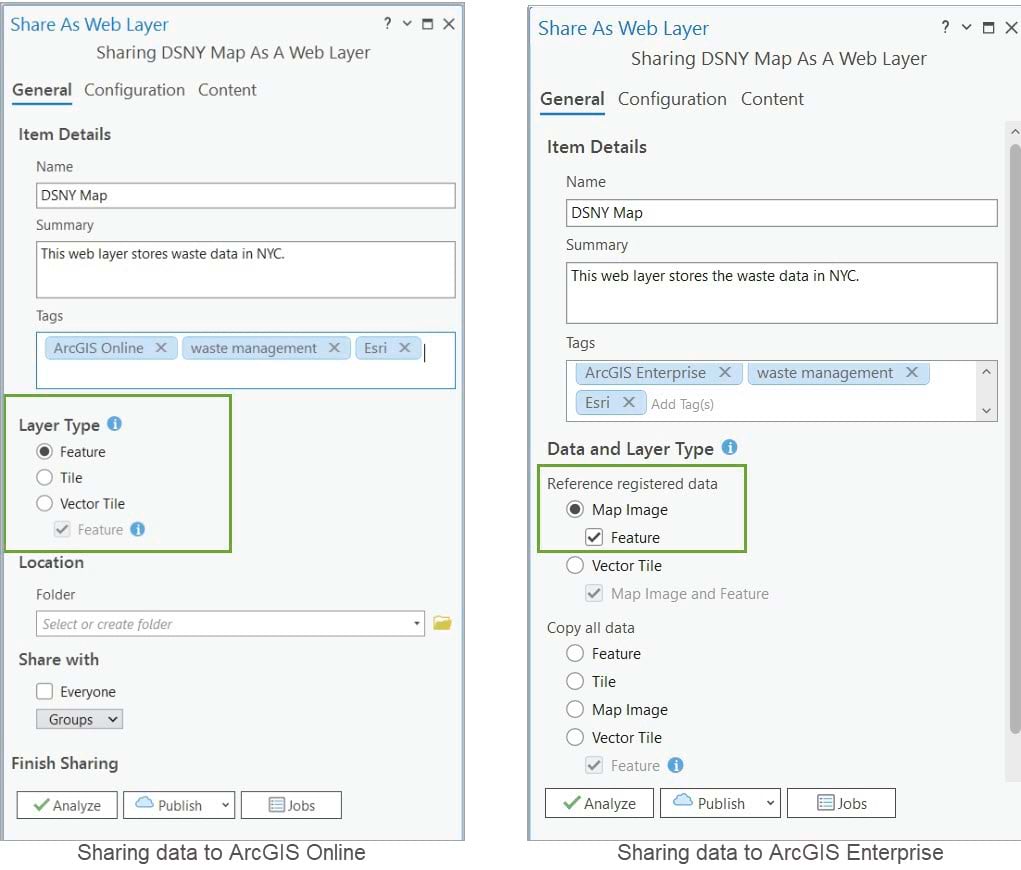 If your active portal is an ArcGIS Enterprise portal, you have additional options. You can choose to share a web layer that either copies all data (similar to ArcGIS Online) or references registered data. When you publish data by referencing registered data, a direct connection is established between the server and the data source. This connection allows edits to be dynamically referenced back to the data source without duplicating it. In this tutorial, you’ll explore sharing data by reference to ArcGIS Enterprise.