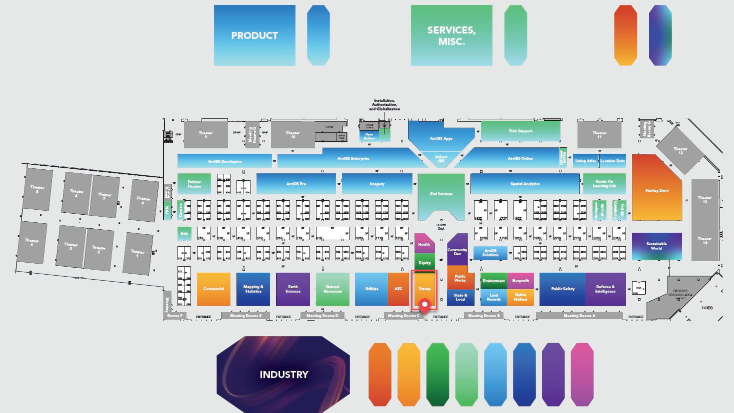 ArcGIS Roads and Highways product experts will be in the Transportation showcase area (indicated using a red box and location pin in the below image). Stop by to chat, ask your questions, and view demos of the latest features and enhancements. The showcase is located on the ground level in Exhibit Hall B and is open during these times.