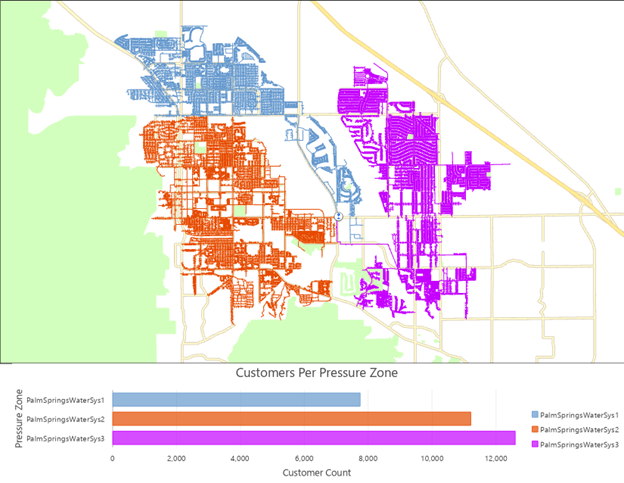 It is a relatively simple operation to calculate the area and customers impacted by a water main leak by performing a network analysis or trace. An undetected leak will cause a drop of pressure for an entire pressure zone, and because many utilities maintain information about the size and number of customers for each pressure zone in their distribution system it is an easy calculation to determine this information by simply looking at which pressure zone the main belongs to.