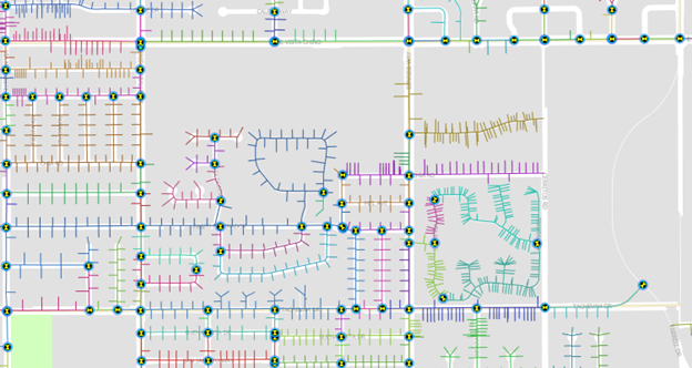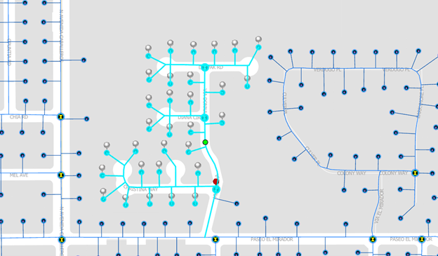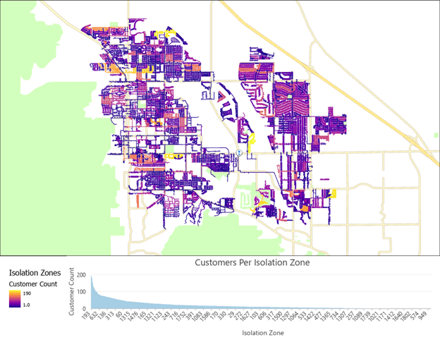 A more important analysis is to look at the minimum number of customers that would be affected by a main breaking. This can be determined by looking at all the valves available to isolate a failing pipe, simulating isolating that section of the network, and then calculating the size of the area impacted and the number of customers affected. This analysis is known as performing an isolation trace and represents such a foundational form of analysis in network models that Esri provides functions for performing this analysis OOTB using products like the ArcGIS Utility Network.