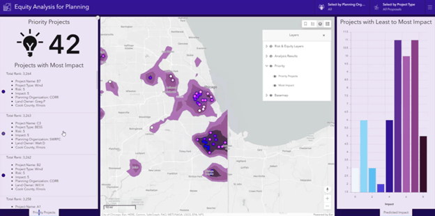 A common approach when presenting this information to management is to prepare slides or printed materials highlighting some of the key project areas identified by your research. In this case, you may use something like ArcGIS Pro to produce a spatial map series for each of your projects that highlights the risk factors and benefits associated with each project.