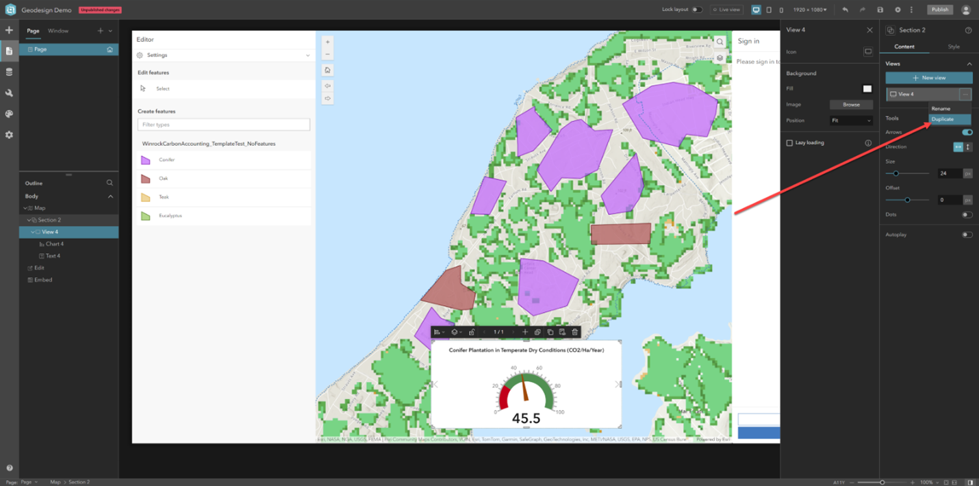 13. Click the settings for the Section widget that contains the Gauge widget, and choose Duplicate to create a copy and compare it to the other designs in the map.
