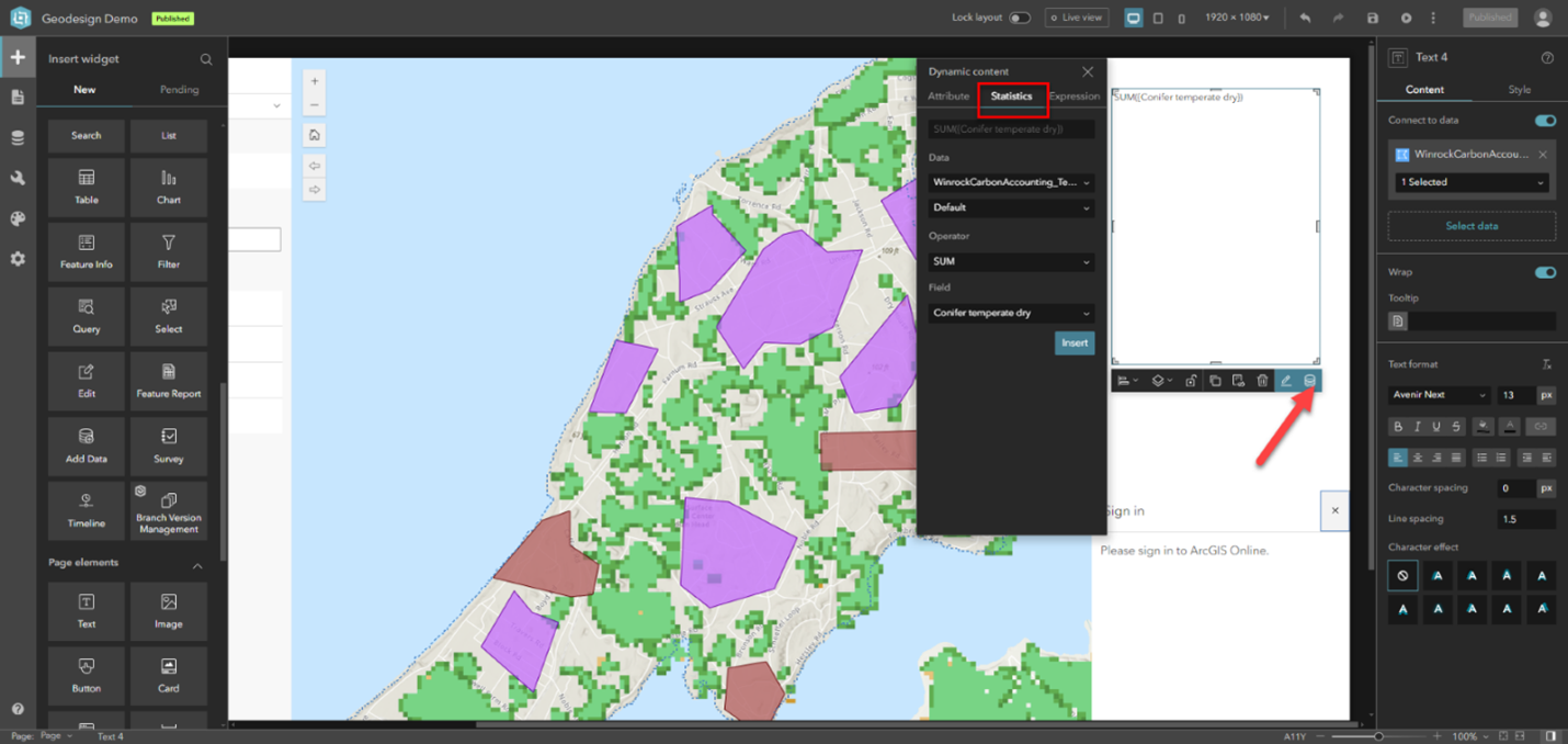 3. Sum the values of a single field using the dynamic content capability of the text widget.