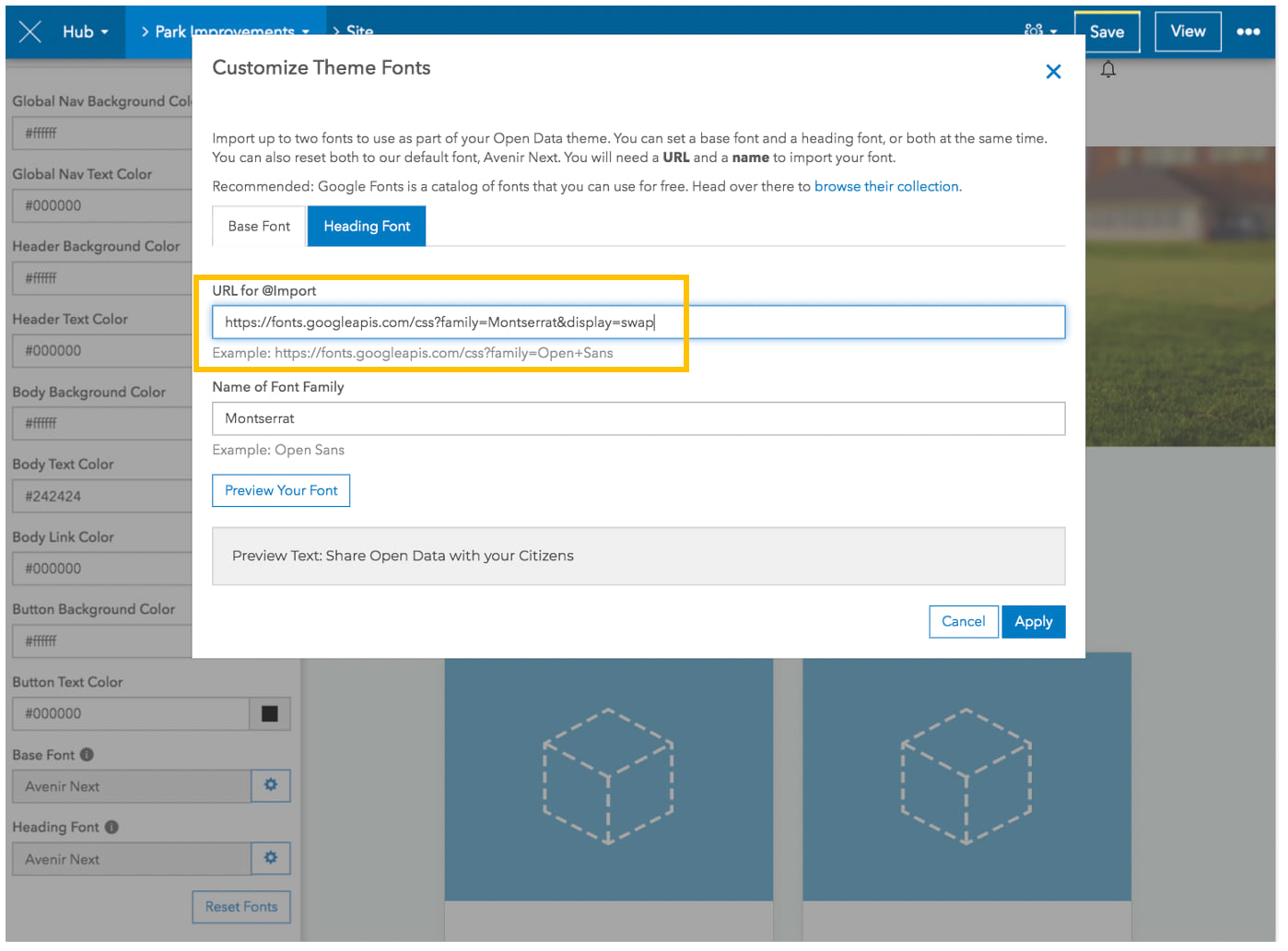 Click the settings button next to the Base Font or Headings Font text fields and insert the copied URL. Click Apply to save your changes.