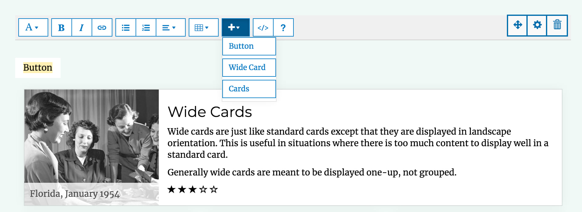 You can also add a single wide card or multiple cards to attract people to external resources. These cards can be modified in code view.
