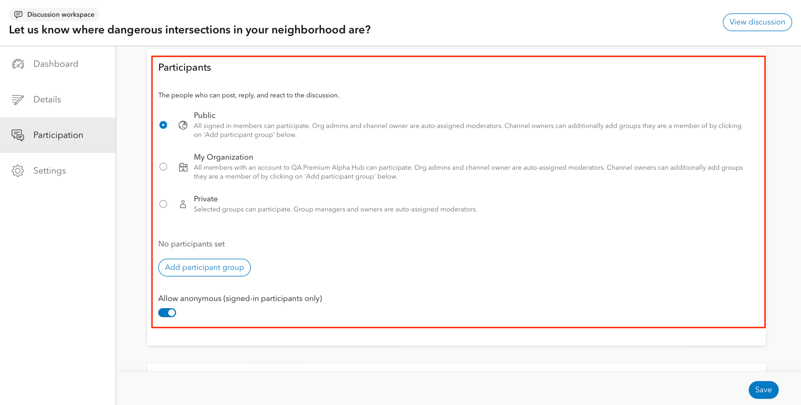 Step 7: Select ‘Participants‘: public, organization, or private (you can add additional participation groups for public and org channels).