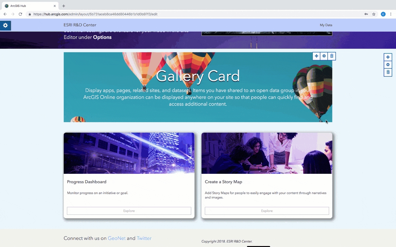 With new gallery card options, you can display a mix of content on your site. Just drop a Gallery card onto your site or page, opt for the new Manual display, then click Add Content to pick and choose from any apps, pages, web map, dashboards, datasets, and additional sites that are shared with your organization.