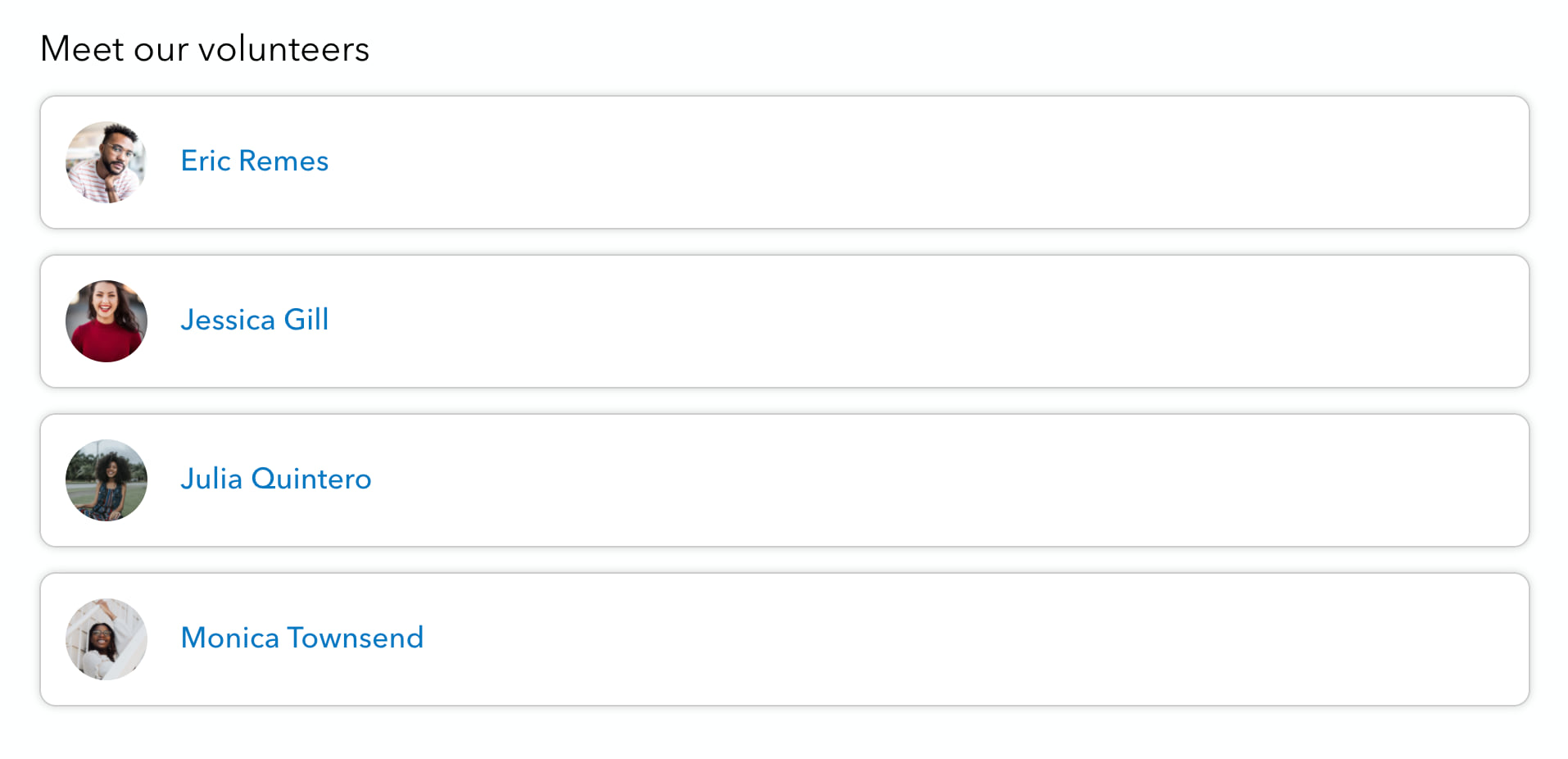 The People card is a great way to introduce your initiative’s team. Visitors can learn more about each team member by clicking on their name and viewing their member profile.