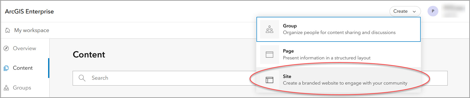 It’s easy to create items using the Create button that is always available on the global navigation header. This button allows you to create a site, page, group, and other content. Options for the Create button depend on your privileges, and the context of what you are viewing.