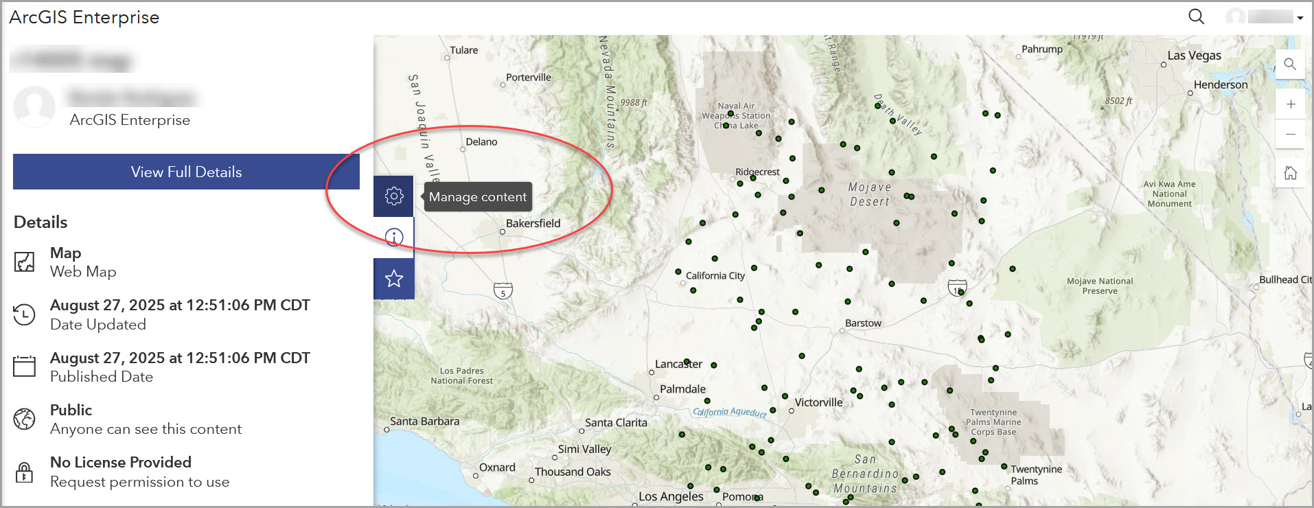If you have edit permissions, you can use the Manage button to open the item’s workspace. When viewing an item, select the Manage content button on the sidebar to open it’s workspace.