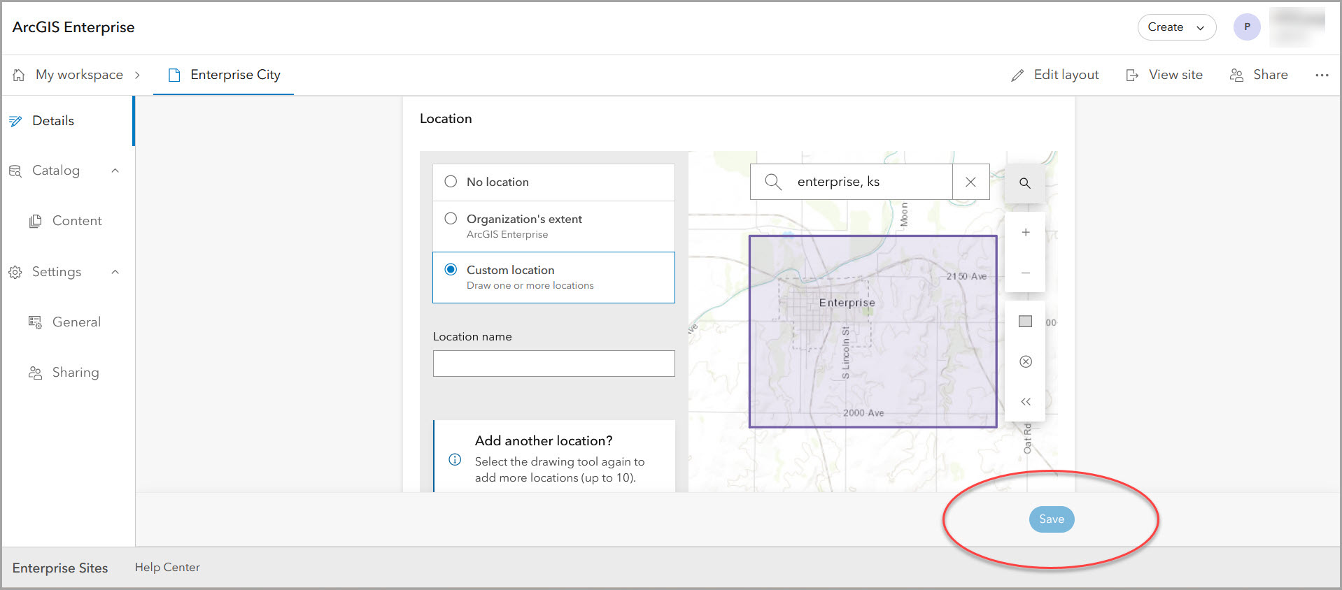 On the Details pane, you can add or edit site information such as title, summary, or description to appear in the site view. Add tags and categories to optimize discovery of the site. If you make changes on any pane, save your edits before navigating away (this applies to all workspaces).