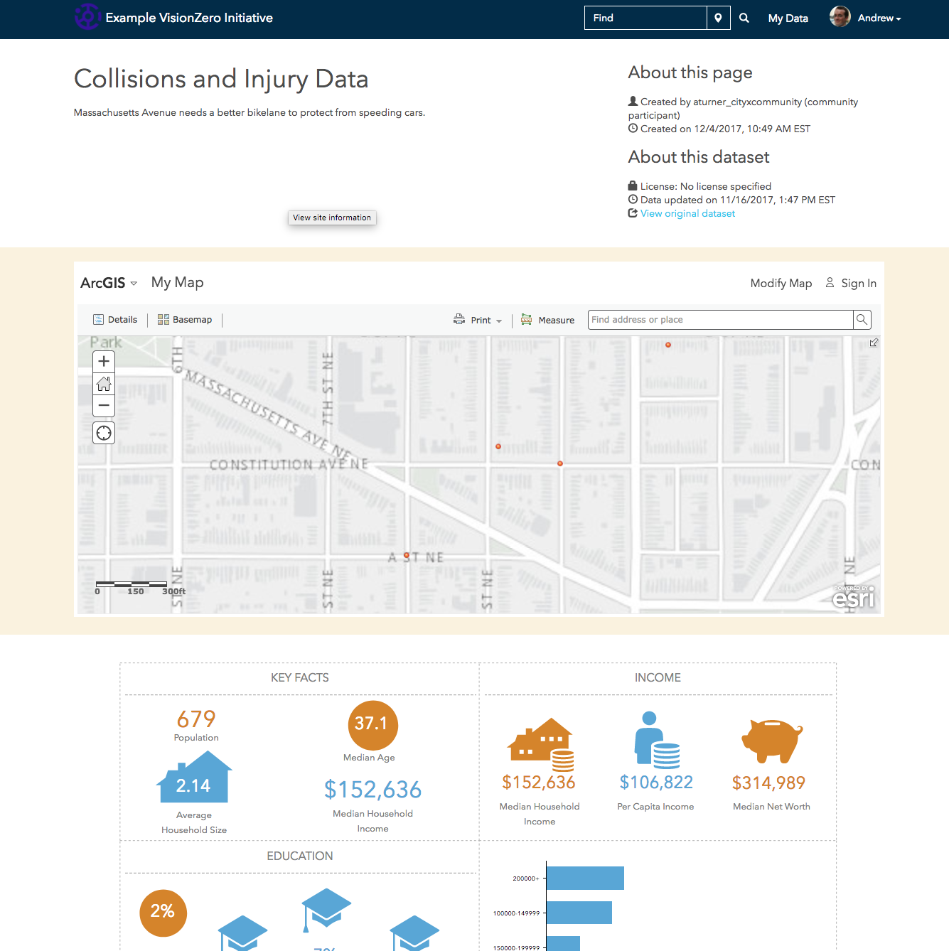 Community members can sign up to your Hub to start analyzing data and contributing local perspectives. Using social, income, and population demographics combined with your open data supports constituents being informed and advocating for policy and operations improvements. These Perspectives are configurable pages where community participants can add more context, images, data and feedback to have a real dialog with your city.