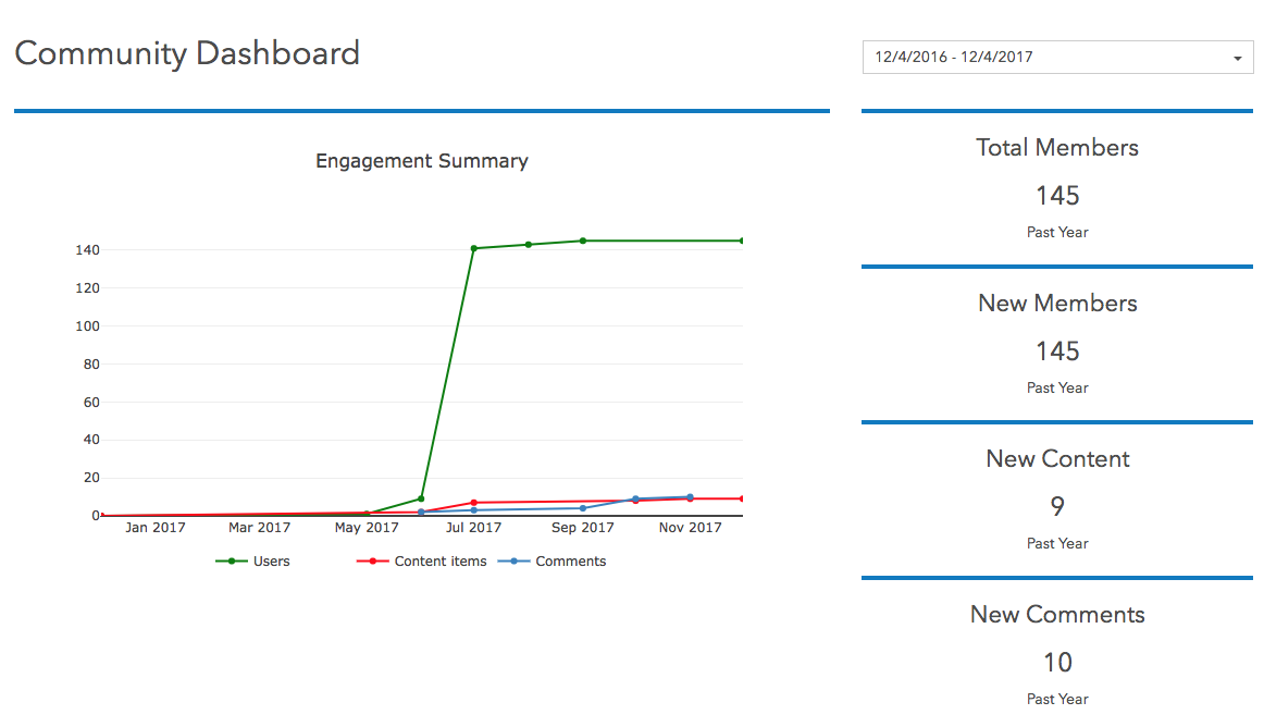 You can also see the cumulative growth of your community over time on the Community Dashboard. This includes new participants, content created, and comments on your datasets and sites. In the future, we will provide more tools to understand and engage directly with your communities of interest.